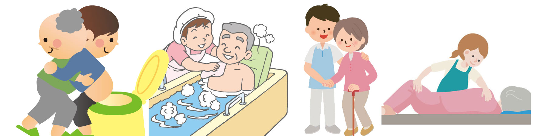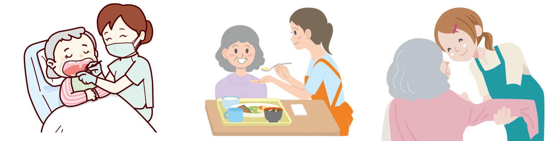 - ◎生活介護・食事介助/体位変換/入浴介助/口腔ケア/衣類着脱/排泄介助/通院時の乗り降り介助/など。